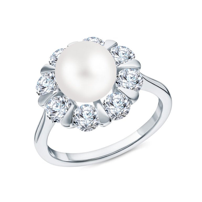 Кольцо, вставка: фианитом бесцветным; жемчуг белый имитация; Серебро 925 пробы.