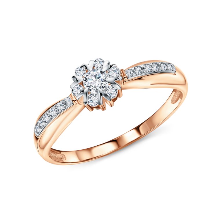 Кольцо с 1 бриллиантом природным, 0.102 карат, огранка круг 57 граней, цвет 4, чистота 5, тип огранки А; 6 бриллиантами природными, 0.077 карат, огранка круг 57 граней, цвет 3, чистота 5, тип огранки А; 12 бриллиантами природными, 0.058 карат, огранка круг 17 граней, цвет 2, чистота 2, тип огранки А; Розовое золото 585 пробы.