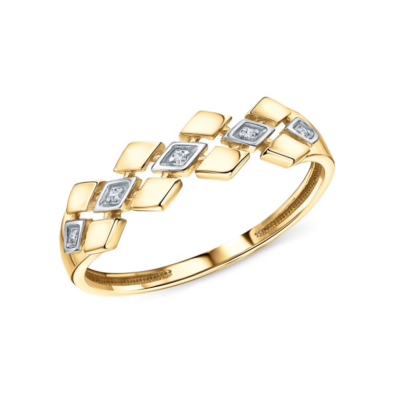 Кольцо с 5 бриллиантами природными, 0.016 карат, огранка круг 17 граней, цвет 2, чистота 2, тип огранки А; Желтое золото 585 пробы.