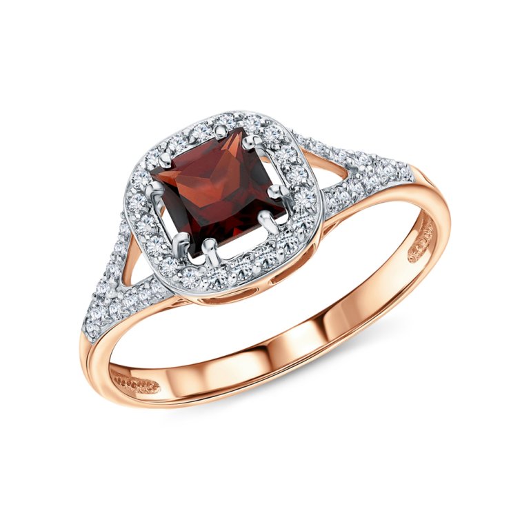 Кольцо с 1 гранатом природным, 0.85 карат, тип огранки Б; фианитом бесцветным; Розовое золото 585 пробы.