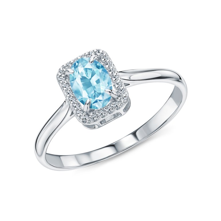 Кольцо с 24 бриллиантами природными, 0.043 карат, огранка круг 17 граней, цвет 2, чистота 2, тип огранки А; 1 аквамарином природным, 0.413 карат, тип огранки Б; Белое золото 585 пробы.
