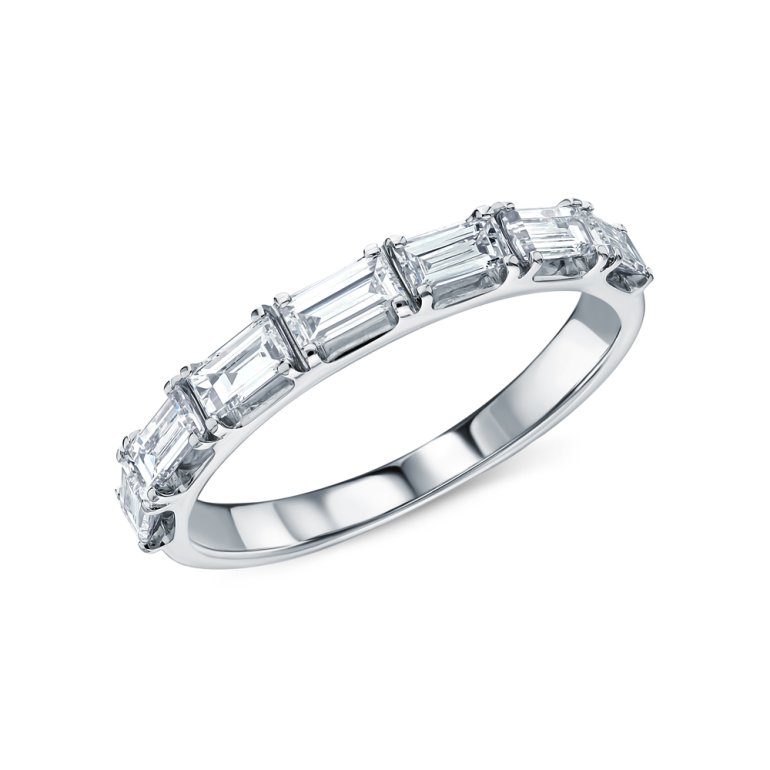 Кольцо с 7 бриллиантами выращенными, 0.79 карат, огранка багет 33 грани, цвет 3, чистота 6, тип огранки А; Белое золото 585 пробы.