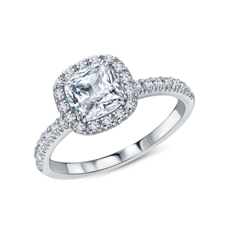 Кольцо с 1 бриллиантом выращенным, 1.06 карат, огранка кушон 57 граней, цвет 4, чистота 5, тип огранки А; 32 бриллиантами выращенными, 0.218 карат, огранка круг 57 граней, цвет 2, чистота 5, тип огранки А; Белое золото 585 пробы.