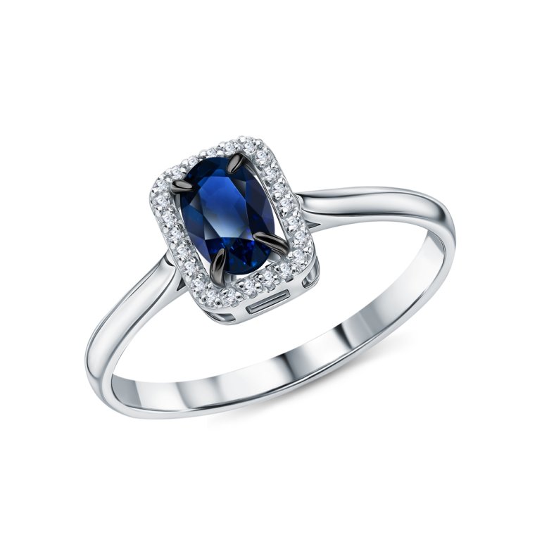 Кольцо с 24 бриллиантами природными, 0.044 карат, огранка круг 17 граней, цвет 2, чистота 2, тип огранки А; 1 сапфиром природным, 0.523 карат, цвет 2, чистота 2, тип огранки Б; Белое золото 585 пробы.