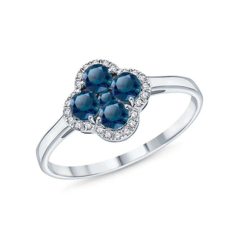 Кольцо с 4 топазами лондон природными, 0.55 карат, тип огранки В; 1 топазом лондон природным, 0.03 карат, тип огранки В; фианитом бесцветным; Белое золото 585 пробы.