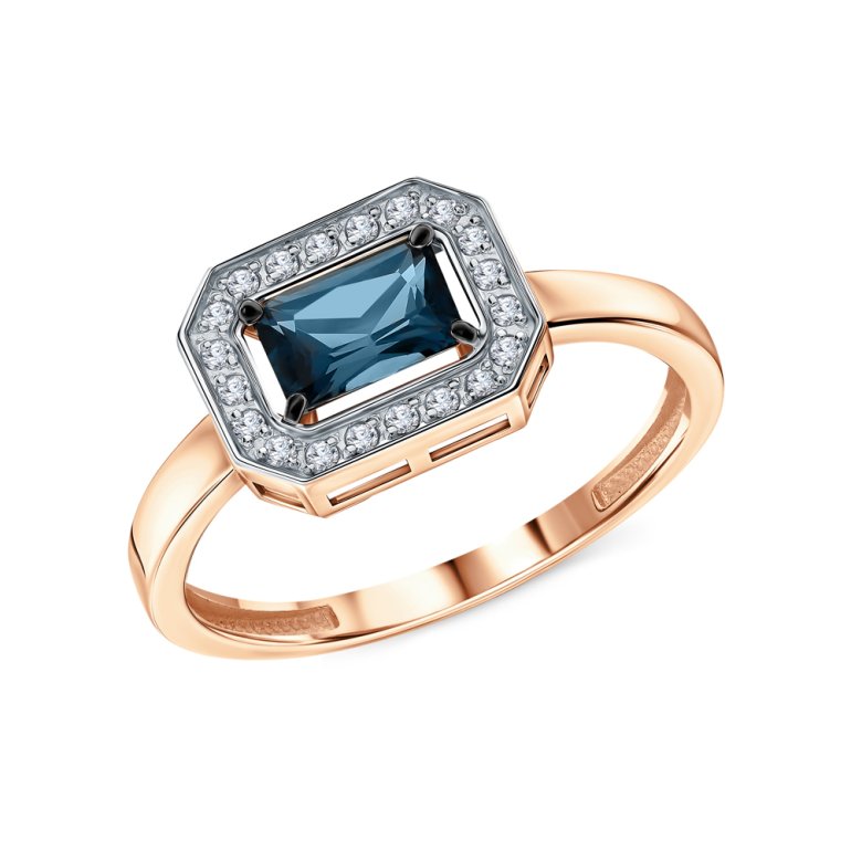 Кольцо с 20 бриллиантами природными, 0.08 карат, огранка круг 17 граней, цвет 2, чистота 2, тип огранки А; 1 топазом лондон природным, 0.671 карат, тип огранки Б; Розовое золото 585 пробы.