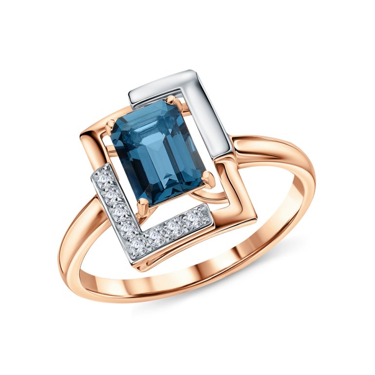 Кольцо с 8 бриллиантами природными, 0.069 карат, огранка круг 57 граней, цвет 3, чистота 6, тип огранки А; 1 топазом лондон природным, 1.205 карат, тип огранки Б; Розовое золото 585 пробы.