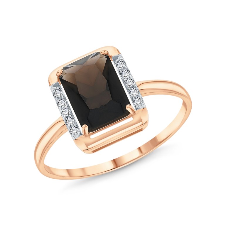Кольцо с 10 бриллиантами природными, 0.041 карат, огранка круг 17 граней, цвет 2, чистота 2, тип огранки А; 1 кварцем дымчатым природным, 1.41 карат, тип огранки Б; Розовое золото 585 пробы.