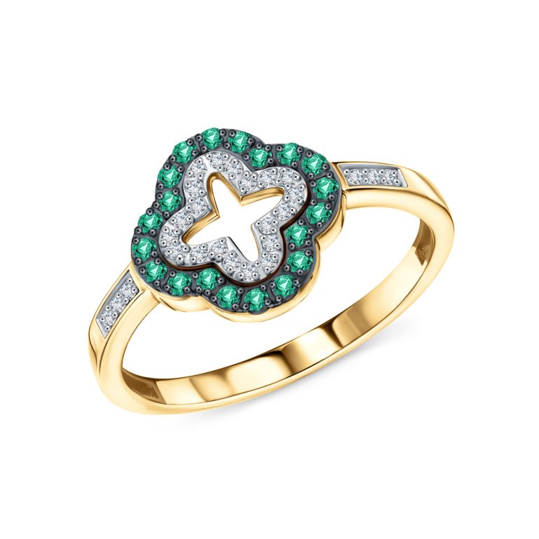 Кольцо с 6 бриллиантами природными, 0.025 карат, огранка круг 17 граней, цвет 2, чистота 2, тип огранки А; 20 бриллиантами природными, 0.047 карат, огранка круг 17 граней, цвет 2, чистота 2, тип огранки А; 20 изумрудами природными, 0.148 карат, цвет 3, чистота 3, тип огранки В; Желтое золото 585 пробы.