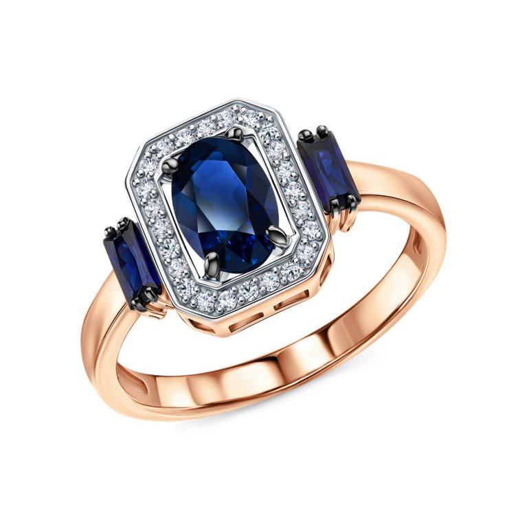 Кольцо с 24 бриллиантами природными, 0.098 карат, огранка круг 17 граней, цвет 2, чистота 2, тип огранки А; 1 сапфиром синтетическим, 0.912 карат, тип огранки Б; 2 сапфирами синтетическими, 0.257 карат, тип огранки Б; Розовое золото 585 пробы.