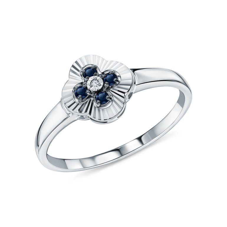 Кольцо с 1 бриллиантом природным, 0.003 карат, огранка круг 17 граней, цвет 2, чистота 2, тип огранки Б; 4 сапфирами природными, 0.069 карат, цвет 2, чистота 2, тип огранки В; Белое золото 585 пробы.