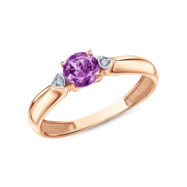 Кольцо с 2 бриллиантами природными, 0.005 карат, огранка круг 17 граней, цвет 2, чистота 2, тип огранки Б; 1 аметистом природным, 0.435 карат, тип огранки В; Розовое золото 585 пробы.