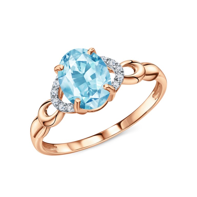 Кольцо с 10 бриллиантами природными, 0.047 карат, огранка круг 17 граней, цвет 2, чистота 2, тип огранки А; 1 топазом скай природным, 1.475 карат, тип огранки Б; Розовое золото 375 пробы.