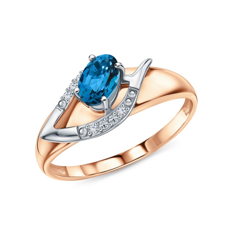 Кольцо с 7 бриллиантами природными, 0.033 карат, огранка круг 17 граней, цвет 2, чистота 2, тип огранки А; 1 топазом лондон природным, 0.51 карат, тип огранки Б; Розовое и белое золото 375 пробы.