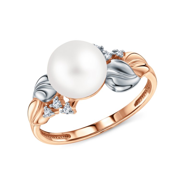 Кольцо с 6 бриллиантами природными, 0.048 карат, огранка круг 17 граней, цвет 2, чистота 2, тип огранки А; 1 жемчугом пресноводным культивированным белым; Розовое золото 585 пробы.