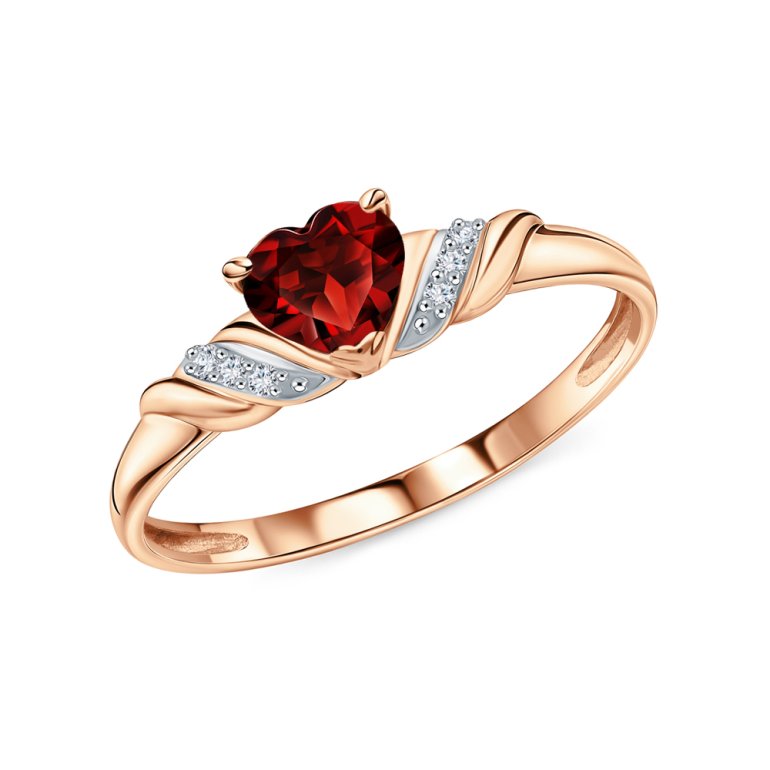 Кольцо с 6 бриллиантами природными, 0.029 карат, огранка круг 17 граней, цвет 2, чистота 2, тип огранки А; 1 гранатом природным, 0.517 карат, тип огранки Б; Розовое золото 585 пробы.