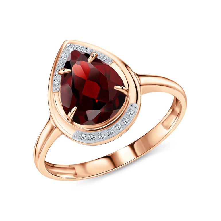 Кольцо с 16 бриллиантами природными, 0.038 карат, огранка круг 17 граней, цвет 2, чистота 2, тип огранки А; 1 гранатом природным, 1.793 карат, тип огранки Б; Розовое золото 585 пробы.