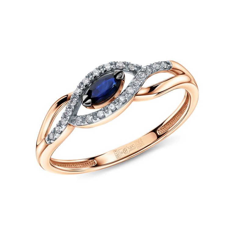 Кольцо с 22 бриллиантами природными, 0.071 карат, огранка круг 17 граней, цвет 2, чистота 2, тип огранки А; 1 сапфиром природным, 0.158 карат, цвет 2, чистота 2, тип огранки Б; Розовое золото 585 пробы.