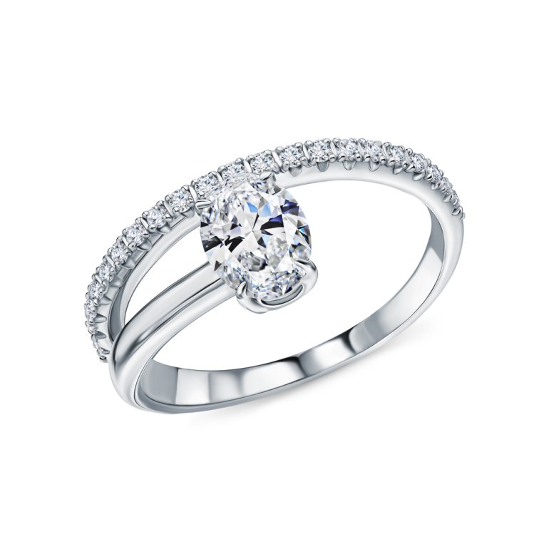 Кольцо с 1 бриллиантом выращенным, 0.696 карат, огранка овал 57 граней, тип огранки А; 21 бриллиантом выращенным, 0.158 карат, огранка круг 57 граней, цвет 3, чистота 6, тип огранки А; Белое золото 585 пробы.