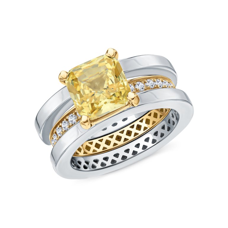 Кольцо, вставка: бриллианит желтый;  фианитом бесцветным; Желтое и белое золото 585 пробы.