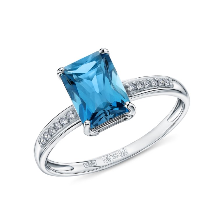 Кольцо с 12 бриллиантами природными, 0.036 карат, огранка круг 17 граней, цвет 2, чистота 2, тип огранки А; 1 топазом лондон природным, 1.86 карат, тип огранки Б; Белое золото 585 пробы.