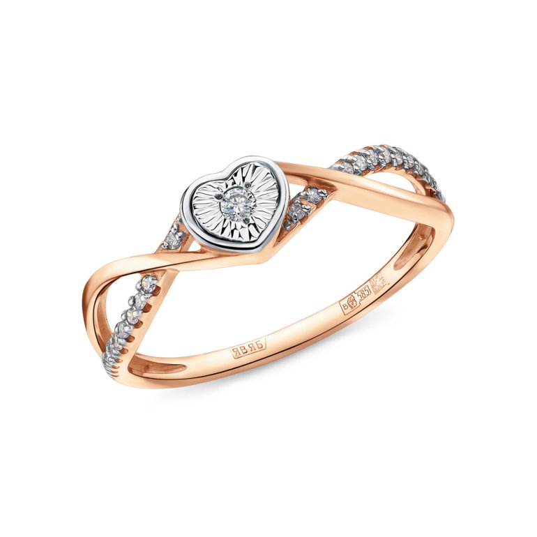 Кольцо с 1 бриллиантом природным, 0.022 карат, огранка круг 57 граней, цвет 3, чистота 6, тип огранки А; 21 бриллиантом природным, 0.065 карат, огранка круг 17 граней, цвет 2, чистота 2, тип огранки А; Розовое и белое золото 585 пробы.