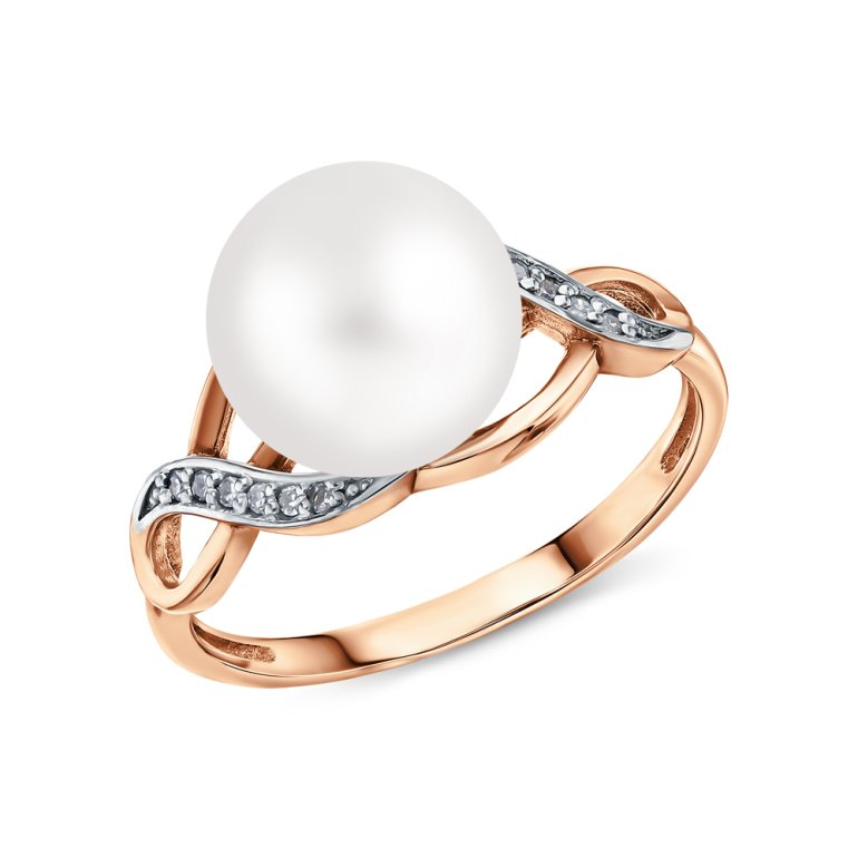 Кольцо с 12 бриллиантами природными, 0.042 карат, огранка круг 17 граней, цвет 2, чистота 2, тип огранки А; 1 жемчугом пресноводным культивированным белым; Розовое золото 585 пробы.