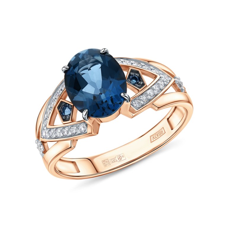 Кольцо с 2 бриллиантами природными, 0.027 карат, огранка круг 17 граней, цвет 2, чистота 2, тип огранки А; 2 бриллиантами природными, 0.018 карат, огранка круг 17 граней, цвет 2, чистота 2, тип огранки А; 20 бриллиантами природными, 0.075 карат, огранка круг 17 граней, цвет 2, чистота 2, тип огранки А; 1 топазом лондон природным, 1.951 карат, тип огранки Б; 2 топазами лондон природными, 0.038 карат, тип огранки В; Розовое золото 585 пробы.