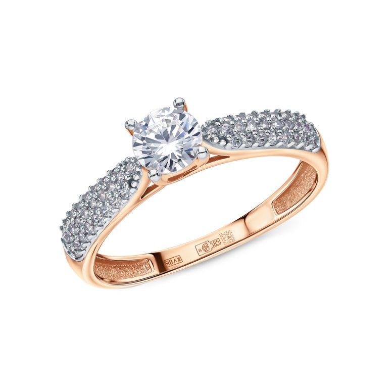 Кольцо, вставка: фианитом бесцветным, 0.75 карат, тип огранки В; фианитом бесцветным, 0.39 карат, тип огранки В; Розовое золото 585 пробы.
