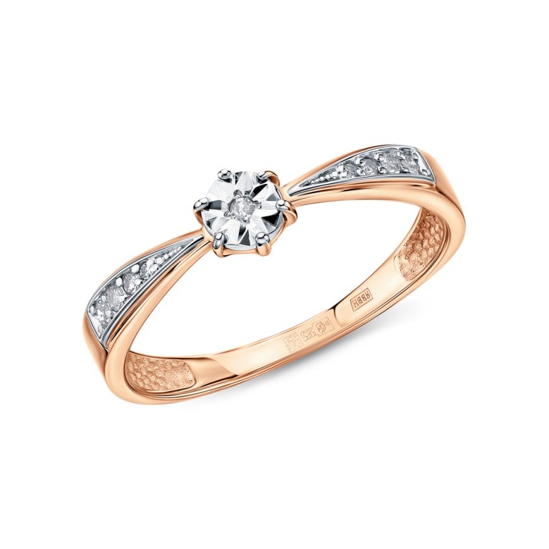 Кольцо с 5 бриллиантами природными, 0.038 карат, огранка круг 17 граней, цвет 2, чистота 2, тип огранки А; 2 бриллиантами природными, 0.009 карат, огранка круг 17 граней, цвет 2, чистота 2, тип огранки А; 2 бриллиантами природными, 0.005 карат, огранка круг 17 граней, цвет 2, чистота 2, тип огранки А; Розовое и белое золото 585 пробы.