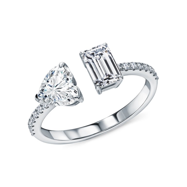 Кольцо с 1 бриллиантом выращенным, 0.803 карат, огранка сердце 57 граней, цвет 3, чистота 6, тип огранки А; 1 бриллиантом выращенным, 0.64 карат, огранка изумрудная 65 граней, цвет 3, чистота 6, тип огранки А; 15 бриллиантами выращенными, 0.109 карат, огранка круг 57 граней, цвет 3, чистота 6, тип огранки А; Белое золото 585 пробы.