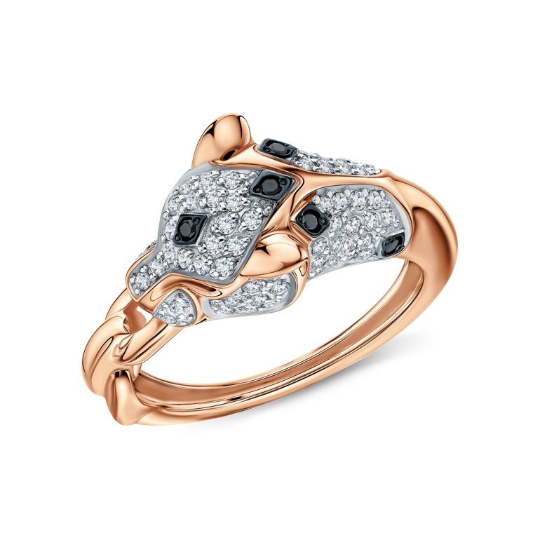 Кольцо с 70 бриллиантами природными, 0.343 карат, огранка круг 17 граней, цвет 2, чистота 2, тип огранки А; 6 бриллиантами черными природными облагороженными, 0.058 карат, огранка круг 57 граней, цвет 7, чистота 6, тип огранки А; 2 бриллиантами черными природными облагороженными, 0.009 карат, огранка круг 57 граней, цвет 7, чистота 6, тип огранки А; Розовое золото 585 пробы.