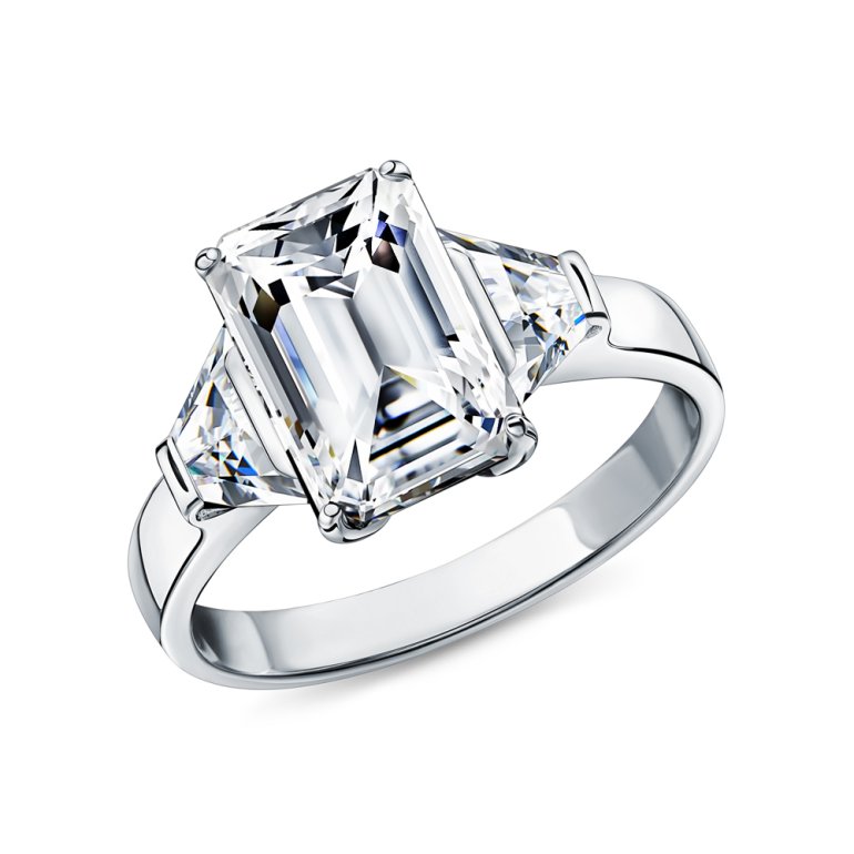 Кольцо с 1 бриллиантом выращенным, 3.09 карат, огранка изумрудная 65 граней, цвет 3, чистота 5, тип огранки А; 2 бриллиантами выращенными, 0.708 карат, огранка багет 25 граней, цвет 4, чистота 5, тип огранки А; Белое золото 585 пробы.