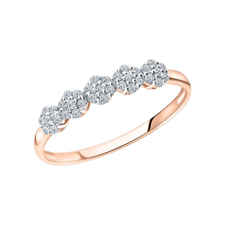 Кольцо с 5 бриллиантами природными, 0.055 карат, огранка круг 57 граней, цвет 3, чистота 6, тип огранки А; 30 бриллиантами природными, 0.18 карат, огранка круг 57 граней, цвет 3, чистота 6, тип огранки А; Розовое золото 585 пробы.