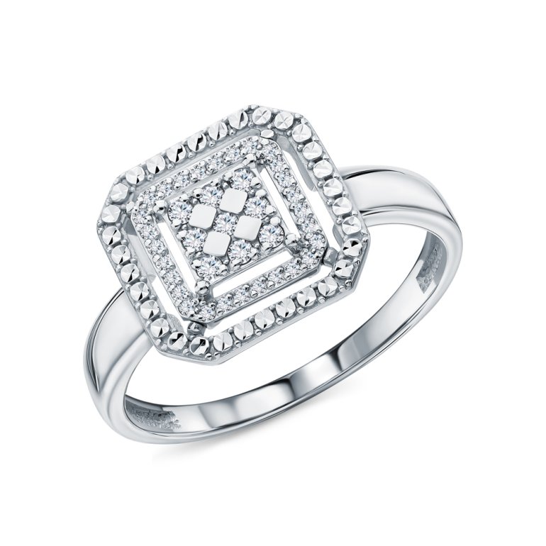 Кольцо с 9 бриллиантами природными, 0.063 карат, огранка круг 57 граней, цвет 3, чистота 6, тип огранки А; 28 бриллиантами природными, 0.051 карат, огранка круг 17 граней, цвет 2, чистота 3, тип огранки А; Белое золото 585 пробы.