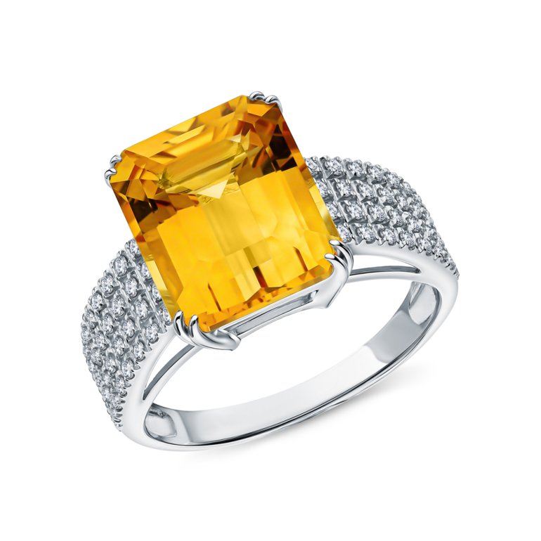 Кольцо с 52 бриллиантами природными, 0.392 карат, огранка круг 57 граней, цвет 3, чистота 6, тип огранки А; 1 цитрином природным, 6.984 карат; Белое золото 585 пробы.