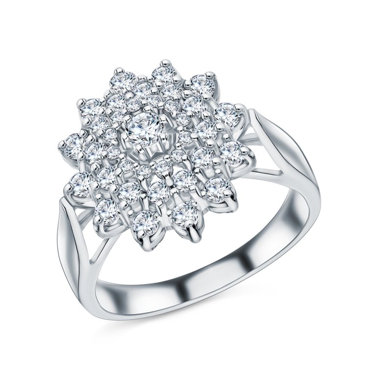 Кольцо с 1 бриллиантом природным, 0.079 карат, огранка круг 57 граней, цвет 3, чистота 6; 12 бриллиантами природными, 0.36 карат, огранка круг 57 граней, цвет 3, чистота 6; 12 бриллиантами природными, 0.278 карат, огранка круг 57 граней, цвет 3, чистота 6; 12 бриллиантами природными, 0.066 карат, огранка круг 17 граней, цвет 2, чистота 2; Белое золото 585 пробы.