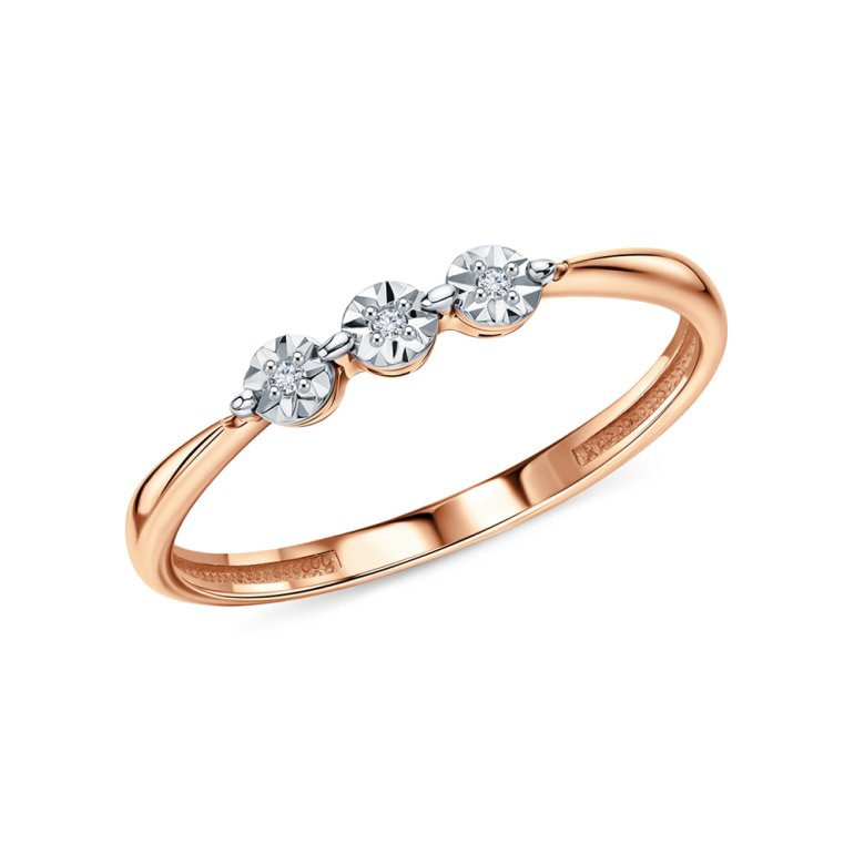 Кольцо с 3 бриллиантами природными, 0.012 карат, огранка круг 17 граней, цвет 2, чистота 2, тип огранки А; Розовое золото 375 пробы.
