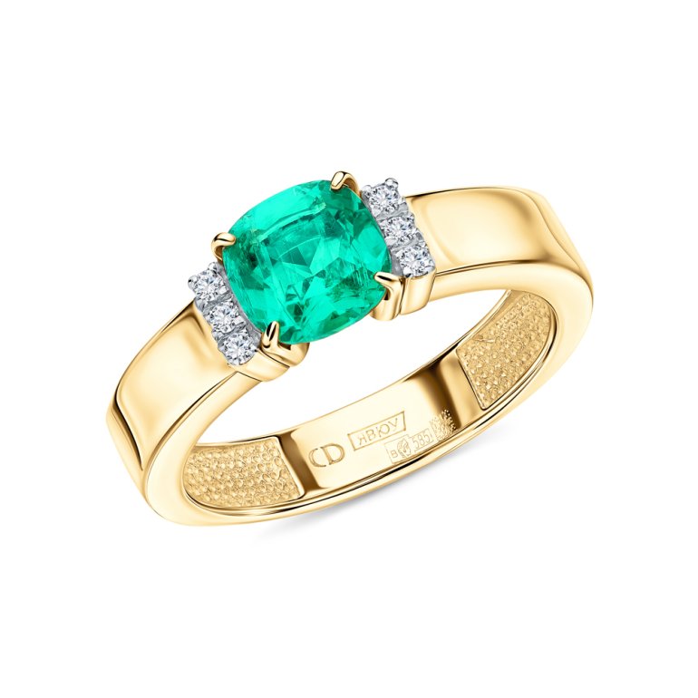 Кольцо с 6 бриллиантами выращенными, 0.044 карат, огранка круг 57 граней, цвет 3, чистота 5, тип огранки А; 1 изумрудом выращенным Колумбия; Желтое золото 585 пробы.