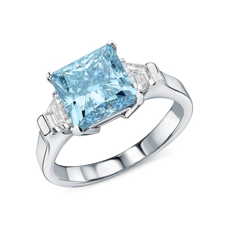 Кольцо с 1 бриллиантом выращенным, 3.08 карат, огранка принцесса 65 граней, цвет Голубой, чистота 2, тип огранки А; 2 бриллиантами выращенными, 0.432 карат, огранка багет 25 граней, цвет 3, чистота 5, тип огранки А; Белое золото 585 пробы.