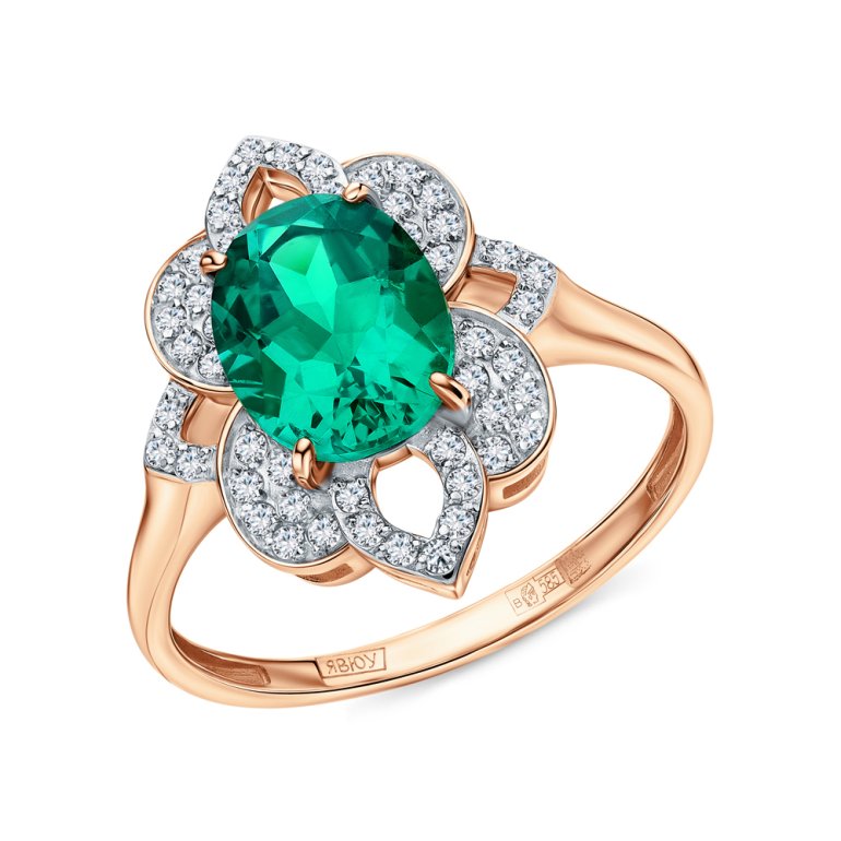 Кольцо с 48 бриллиантами природными, 0.192 карат, огранка круг 17 граней, цвет 2, чистота 2, тип огранки А; 1 изумрудом выращенным Колумбия, 1.643 карат; Розовое золото 585 пробы.