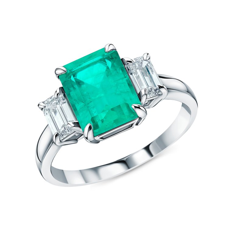 Кольцо с 1 изумрудом выращенным Колумбия, 2.151 карат, тип огранки Б; 2 бриллиантами выращенными, 0.635 карат, огранка изумрудная 65 граней, цвет 4, чистота 5, тип огранки А; Белое золото 585 пробы.