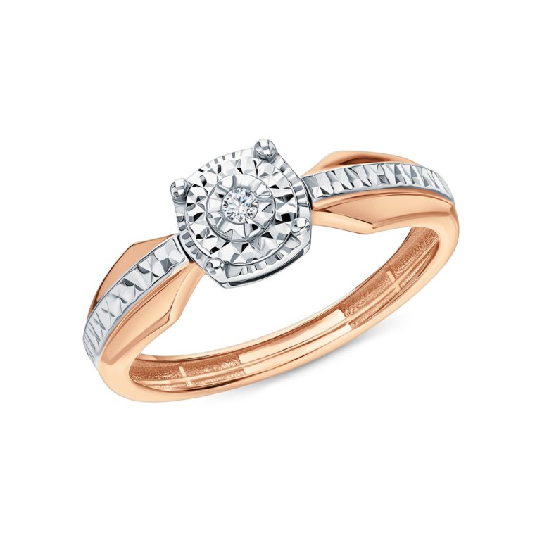 Кольцо с 1 бриллиантом природным, 0.019 карат, огранка круг 57 граней, цвет 3, чистота 6, тип огранки А; Розовое и белое золото 585 пробы.