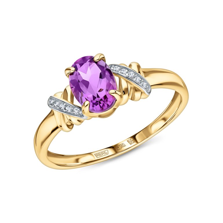 Кольцо с 10 бриллиантами природными, 0.02 карат, огранка круг 17 граней, цвет 2, чистота 2, тип огранки А; 1 аметистом природным, 0.686 карат; Желтое золото 585 пробы.