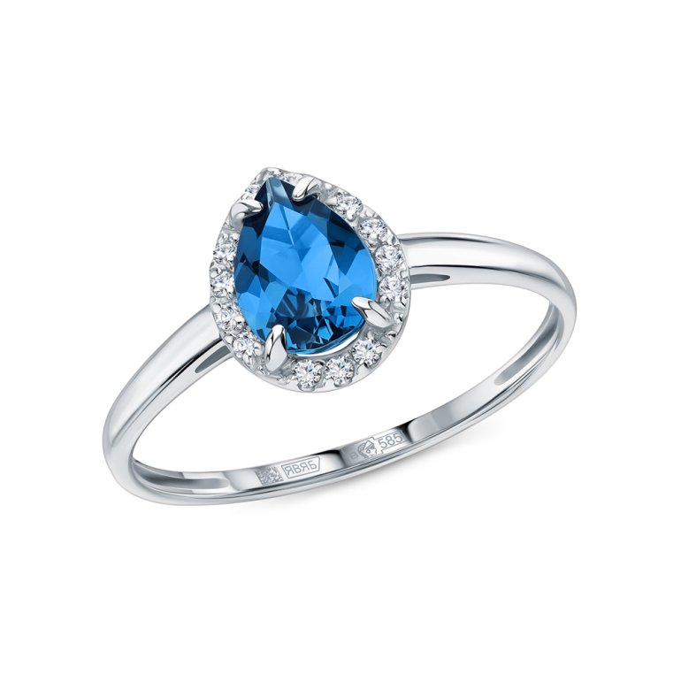 Кольцо с 13 бриллиантами природными, 0.055 карат, огранка круг 17 граней, цвет 2, чистота 2, тип огранки А; 1 топазом лондон природным, 0.769 карат; Белое золото 585 пробы.