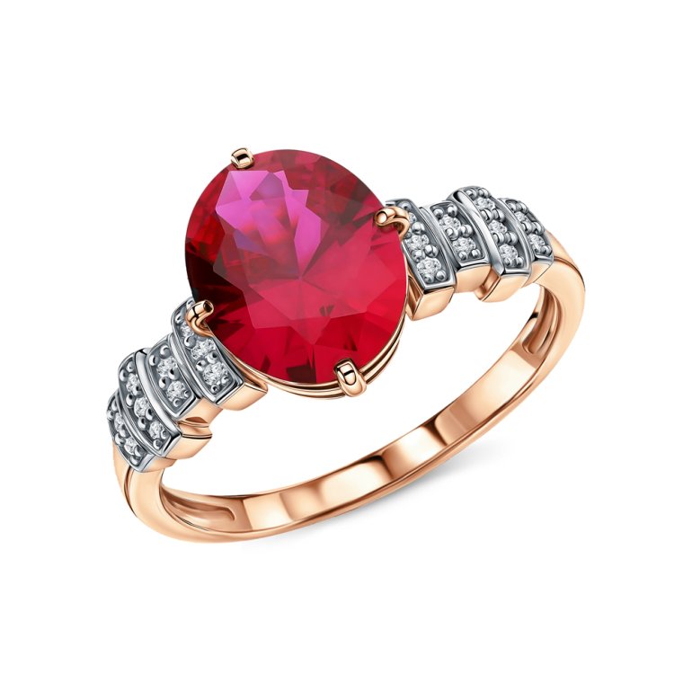 Кольцо с 20 бриллиантами природными, 0.09 карат, огранка круг 17 граней, цвет 2, чистота 3, тип огранки А; 1 рубином синтетическим, 2.88 карат; Розовое золото 585 пробы.