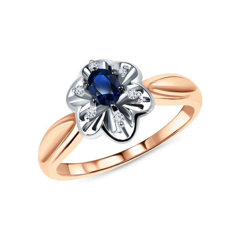Кольцо с 6 бриллиантами природными, 0.024 карат, огранка круг 17 граней, цвет 2, чистота 2, тип огранки А; 1 сапфиром природным, 0.195 карат, цвет 2, чистота 2, тип огранки Б; Розовое и белое золото 585 пробы.