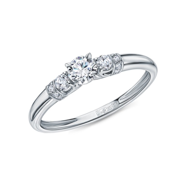 Кольцо с 1 бриллиантом выращенным, 0.3 карат, огранка круг 57 граней, цвет 4, чистота 5, тип огранки В; 2 бриллиантами выращенными, 0.085 карат, огранка круг 57 граней, цвет 3, чистота 5, тип огранки В; 10 бриллиантами выращенными, 0.047 карат, огранка круг 57 граней, цвет 3, чистота 5, тип огранки В; Белое золото 585 пробы.