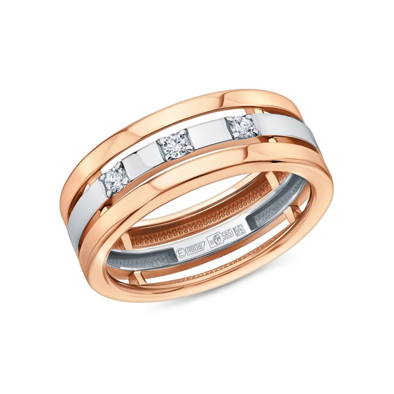 Кольцо с 3 бриллиантами природными, 0.078 карат, огранка круг 57 граней, цвет 4, чистота 5, тип огранки А; Розовое и белое золото 585 пробы.