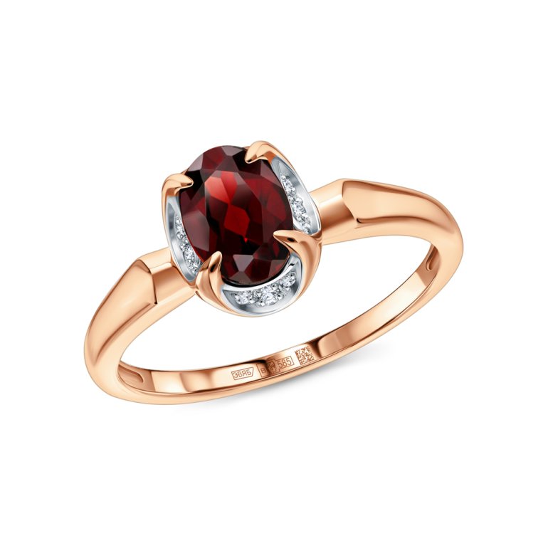 Кольцо с 4 бриллиантами природными, 0.017 карат, огранка круг 17 граней, цвет 2, чистота 2, тип огранки А; 8 бриллиантами природными, 0.014 карат, огранка круг 17 граней, цвет 2, чистота 2, тип огранки А; 1 гранатом природным, 0.88 карат; Розовое золото 585 пробы.